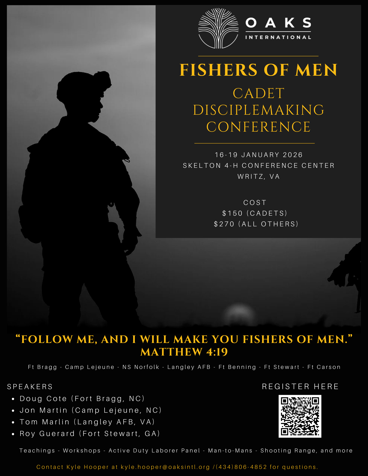 The weekend will be focused around helping cadets grow in the heart, vision, and skills of becoming lifelong disicples and disciplemakers through teachings, workshops, and man-to-man’s with staff and laborers from a variety of Oaks Military Disciplemaking Communities.